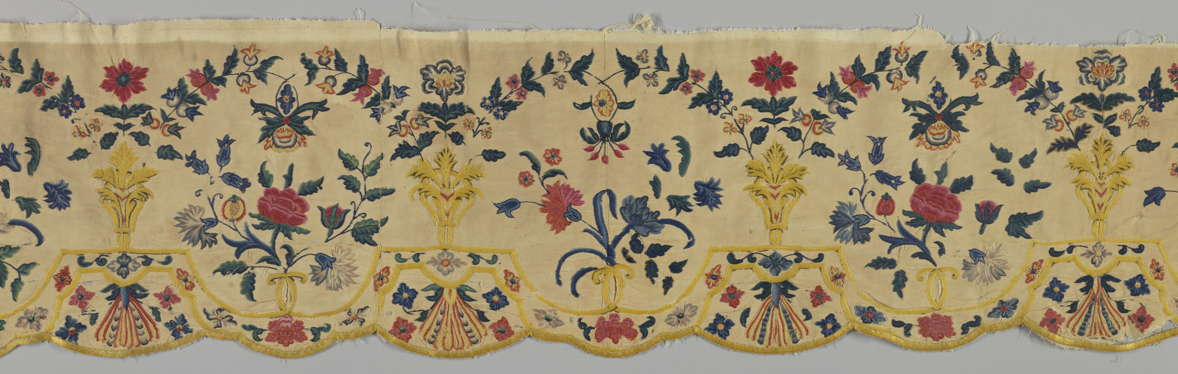 This is a Textile. It is dated mid-18th century and we acquired it in 1957. Its medium is crewel wool on cotton and its technique is embriodered on tabby weave. It is a part of the Textiles department.