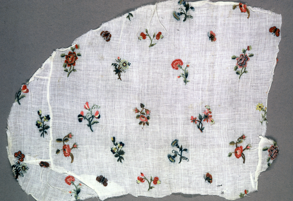 This is a Fragment. It is dated early 19th century and we acquired it in 1957. Its medium is crewel wool on cotton and its technique is long and short satin, and stem stitch embroidery on plain weave. It is a part of the Textiles department.