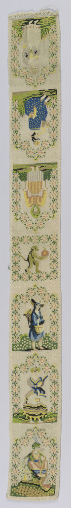 This is a Band. It is dated early 19th century and we acquired it in 1957. Its medium is linen, silk and its technique is counted stitch embroidery. It is a part of the Textiles department.