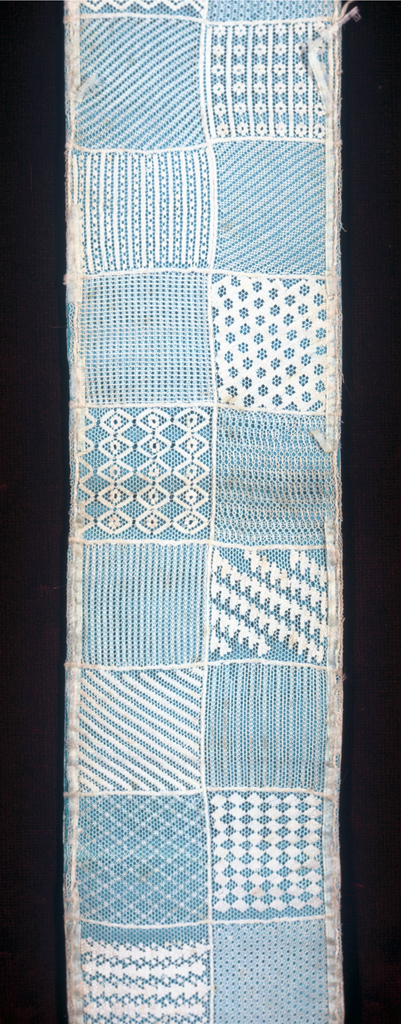This is a Sampler. It is dated early 19th century and we acquired it in 1957. Its medium is cotton, paper and its technique is embroidered on net. It is a part of the Textiles department.