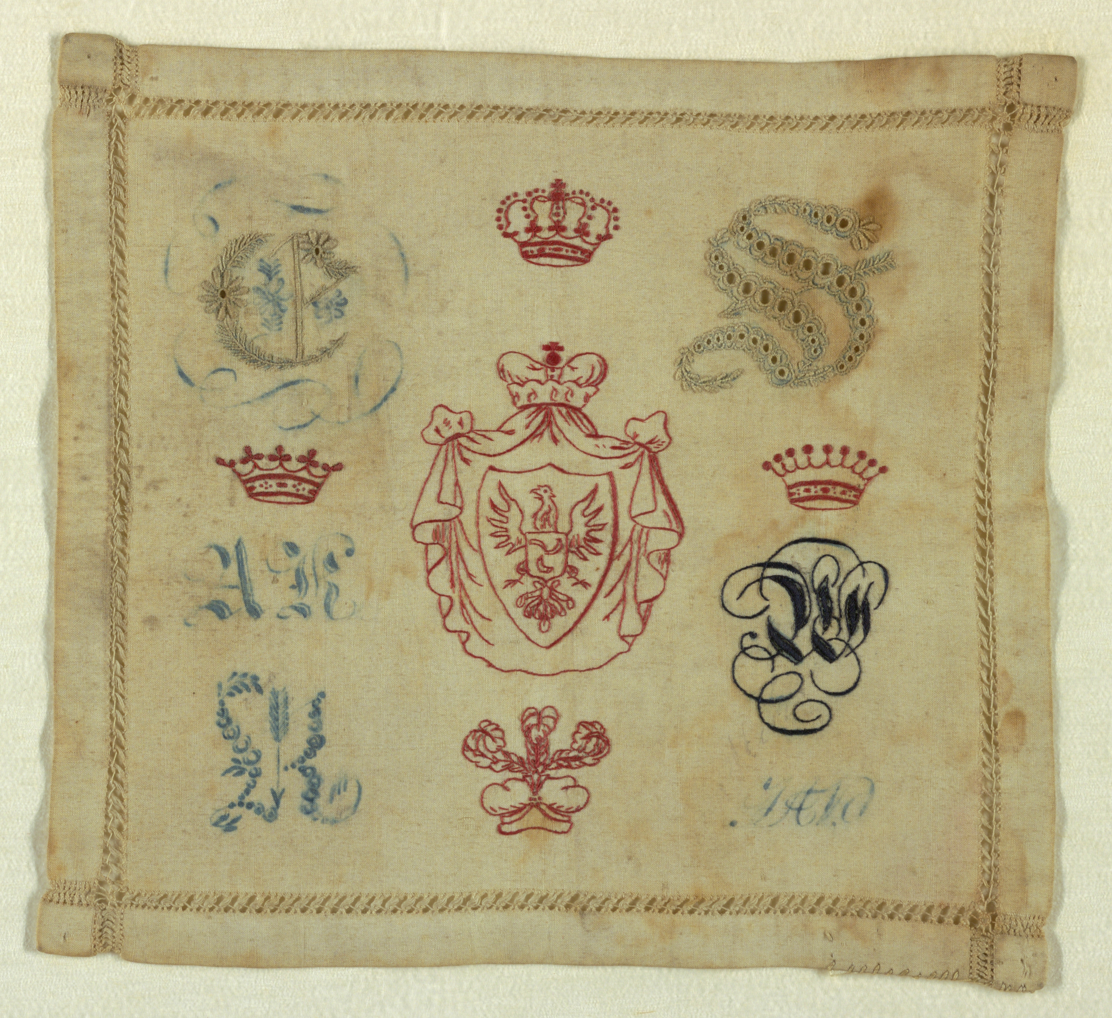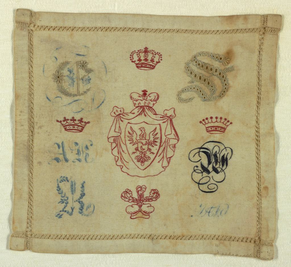 Sampler (Germany); cotton, silk; H x W: 14.3 x 13.3 cm (5 5/8 x 5 1/4 in.); Gift of the estate of Mrs. Lathrop Colgate Harper; 1957-180-44