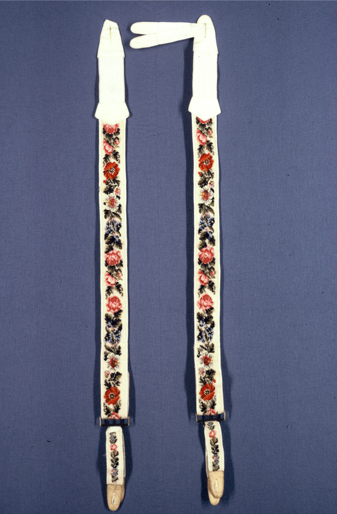 This is a Suspender. We acquired it in 1957. Its technique is counted stitch embroidery. It is a part of the Textiles department.