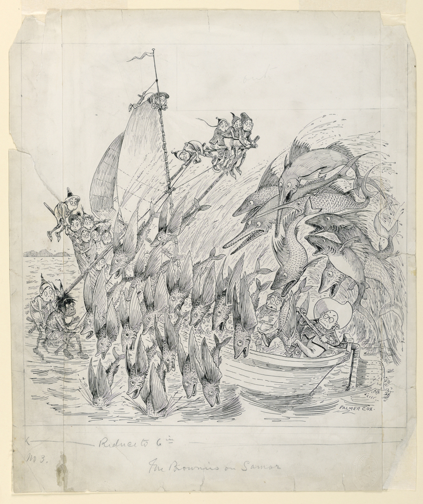 Drawing, "The Brownies on Samar": Sailing a Prahu, Illustration for "The Brownies in the Phillippines" (New York, Century Company, 1904, p. 109); Palmer Cox (1840 – 1924); Published by The Century Company; USA; pen and black ink over graphite on slick white paper; H x W: 35.2 × 29.5 cm (13 7/8 × 11 5/8 in.); Museum purchase through gift of the Estate of David Wolfe Bishop; 1957-185-5