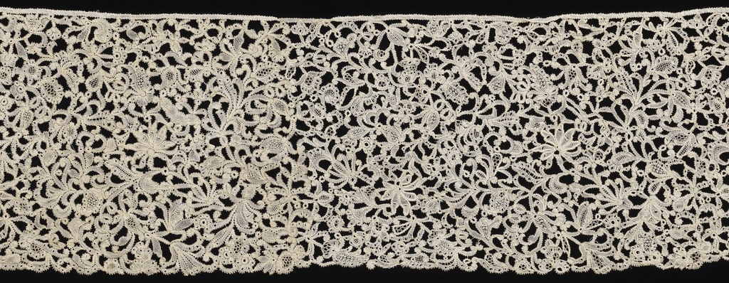 This is a Border. It is dated 19th century and we acquired it in 1957. Its medium is linen and its technique is brussels style bobbin lace. It is a part of the Textiles department.