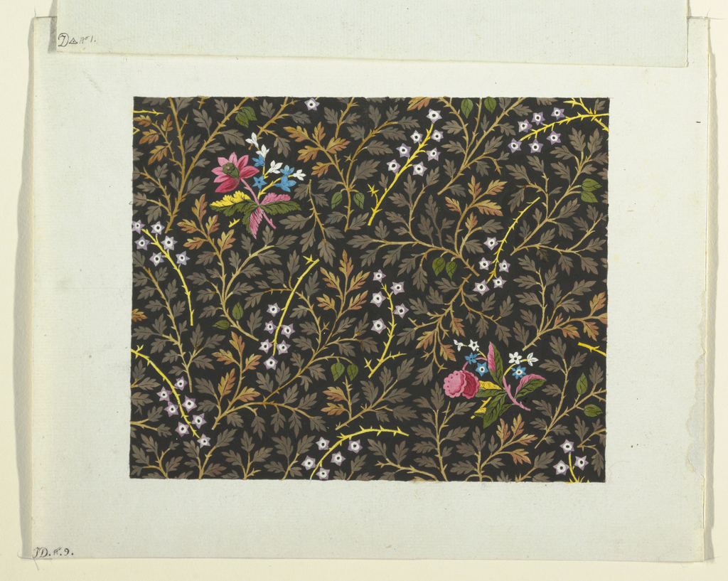 Drawing, Floral design for printed textiles; Designed by Louis-Albert DuBois (Swiss, 1752–1818); Manufactured by Fabrique de Fazy aux Bergues; France; brush and gouache, graphite on white wove paper; Sheet: 20.7 x 25.7 cm (8 1/8 x 10 1/8 in) Image: 14.6 x 18.3 cm (5 3/4 x 7 3/16 in); Museum purchase from Friends of the Museum Fund; 1957-46-11