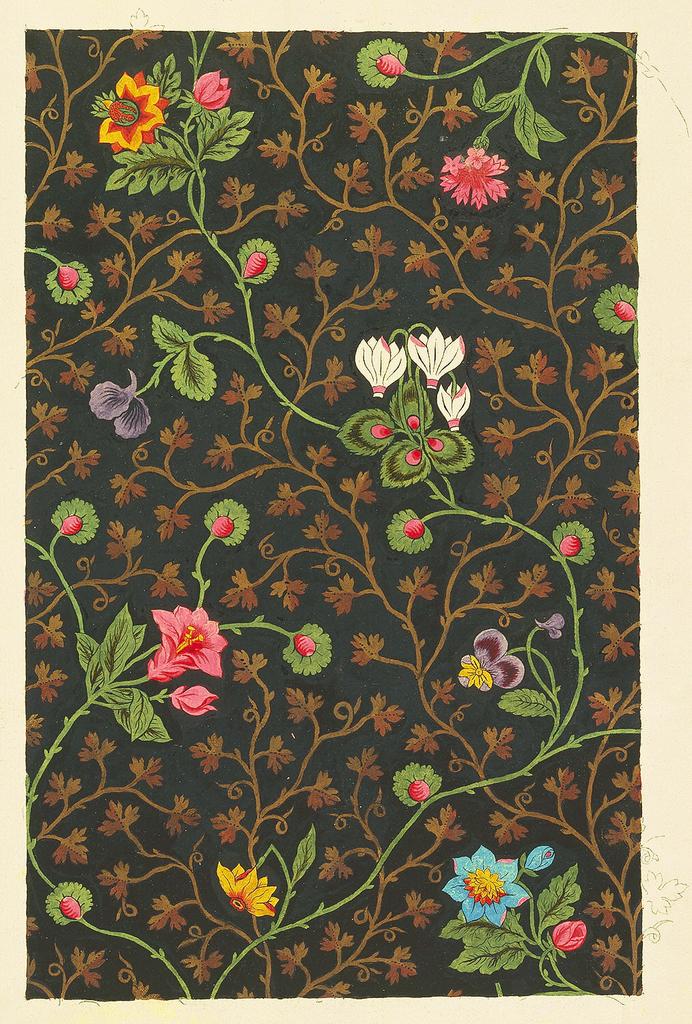 Drawing, Floral design for printed textiles; Designed by Jean DuBois (Swiss, 1789 - 1849); Switzerland; brush and gouache, graphite on white wove paper; Sheet: 37.8 x 28.2 cm (14 7/8 x 11 1/8 in.) Image: 28.3 x 18.2 cm (11 1/8 x 7 3/16 in.); Museum purchase from Friends of the Museum Fund; 1957-46-12