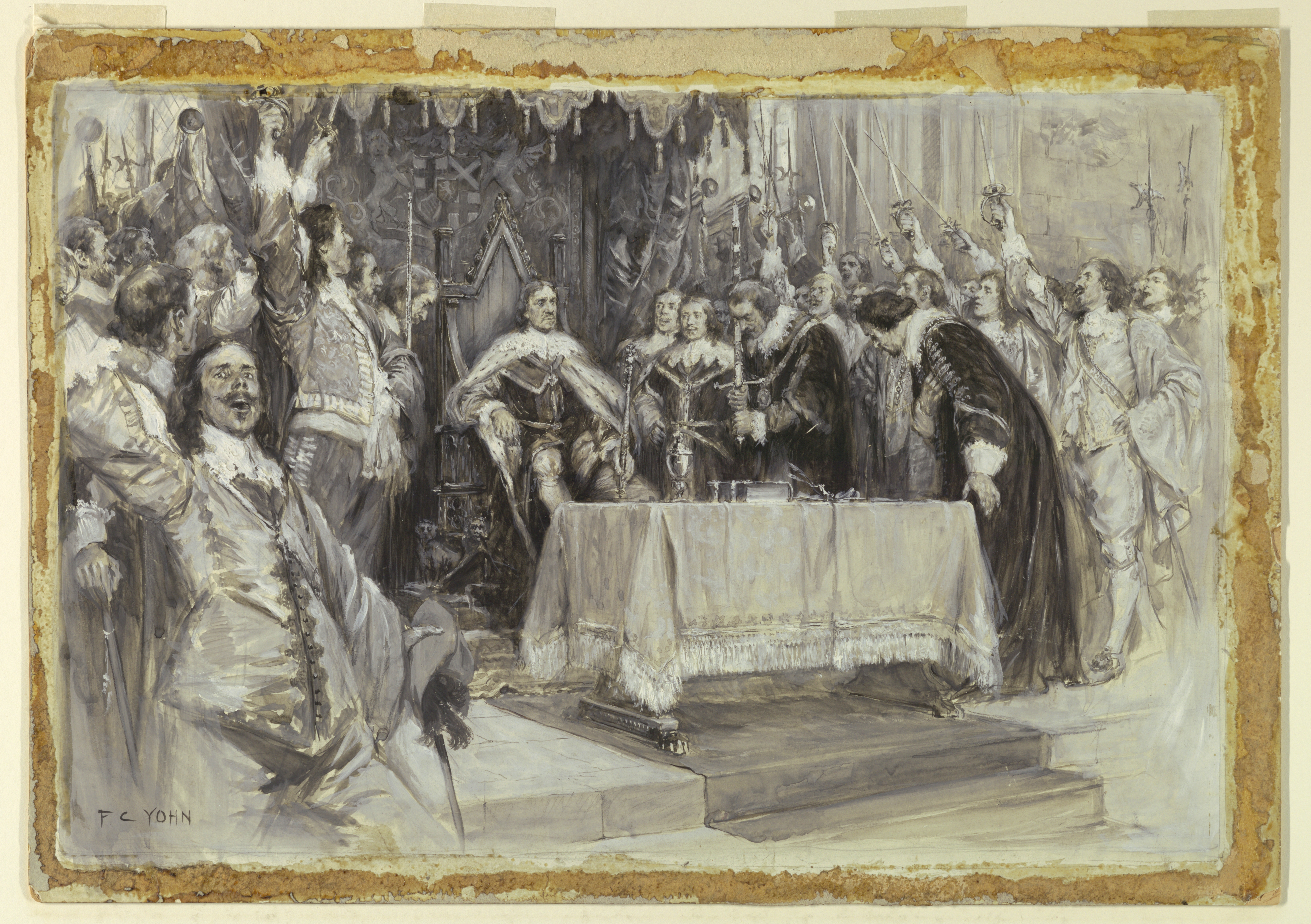 Drawing, The Second Installation of Cromwell as Protector, in Westminster Hall, June 26, 1657; Frederick Coffay Yohn (American, 1875 - 1933); USA; brush and grey and black watercolor, white gouache, on illustration board; 42.5 × 60.3 cm (16 3/4 × 23 3/4 in.); Gift of F. Elizabeth De Voy; 1957-58-3