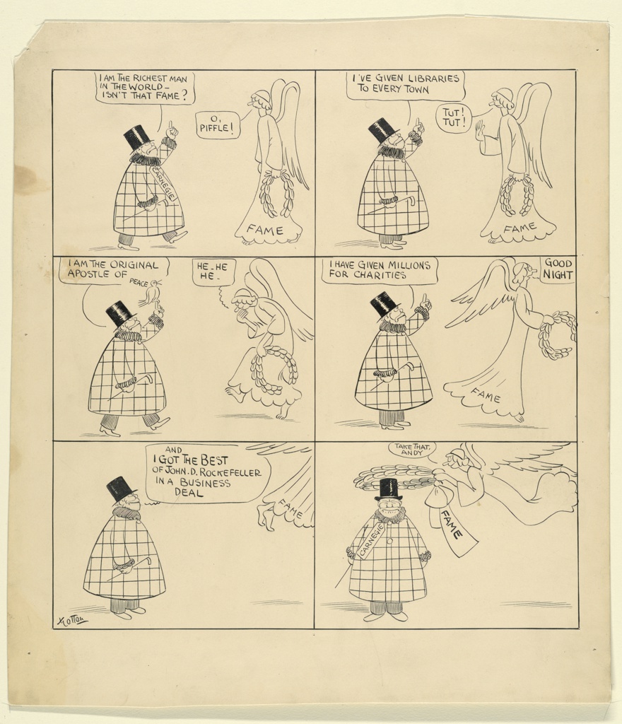 This is a Drawing. It was subject: Andrew Carnegie. It is dated ca. 1910 and we acquired it in 1957. Its medium is pen and black ink on cream illustration board. It is a part of the Drawings, Prints, and Graphic Design department.
