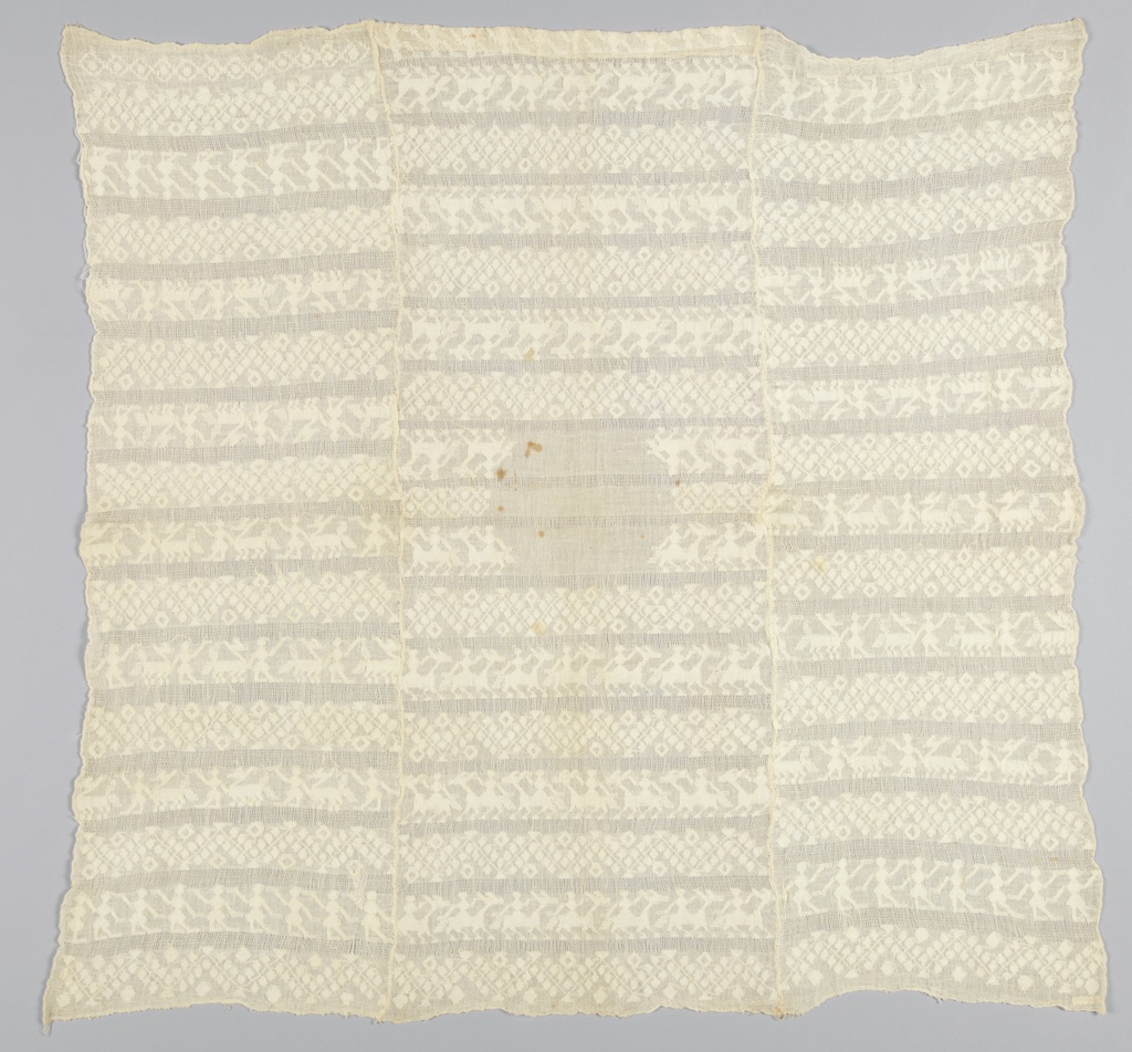 This is a Uncut huipil (blouse). It is dated 1900–1950 and we acquired it in 1957. Its medium is cotton and its technique is plain weave with supplementary weft patterning. It is a part of the Textiles department.