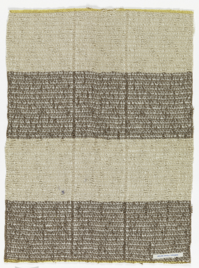 This is a Sample. It was designed by Helen Kroll Kramer and woven by Helen Kroll Kramer. It is dated 1930–58 and we acquired it in 1958. Its medium is cotton, synthetic and its technique is twill woven. It is a part of the Textiles department.
