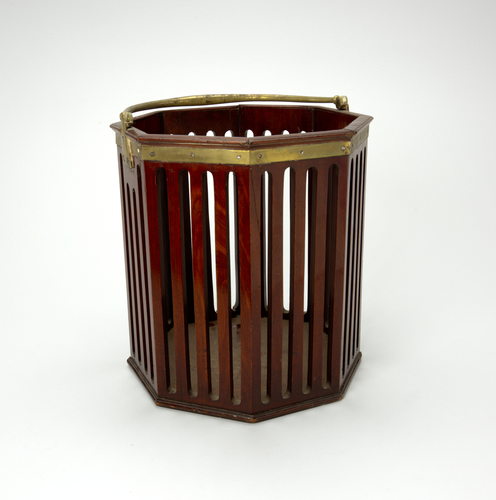 This is a Bucket or plate pail. It is dated 1750–1800 and we acquired it in 1958. Its medium is mahogany, brass, bronze. It is a part of the Product Design and Decorative Arts department.