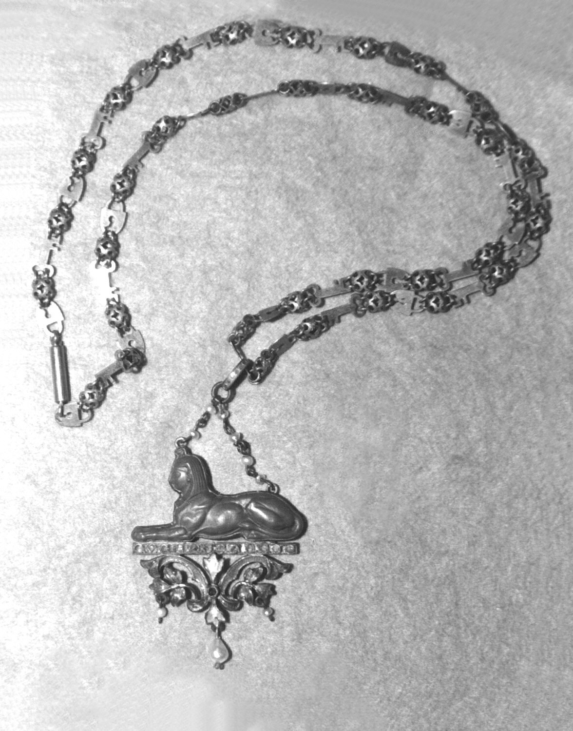 This is a Necklace and pendant. It is dated ca. 1870 and we acquired it in 1958. Its medium is silver, enamel, jasper, pearls, glass. It is a part of the Product Design and Decorative Arts department.