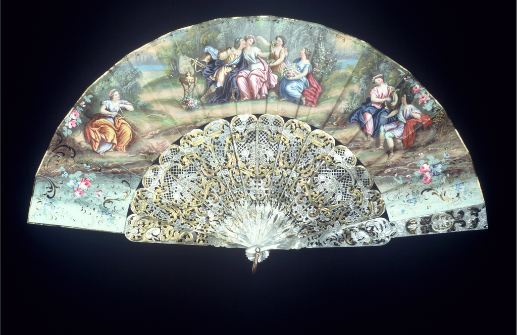 This is a Pleated fan. It is dated ca. 1860 and we acquired it in 1958. Its medium is paper leaf with hand-colored lithograph, pierced, carved and gilded mother-of-pearl sticks, rivet set with a faceted stone, gilt metal bail . It is a part of the Textiles department.