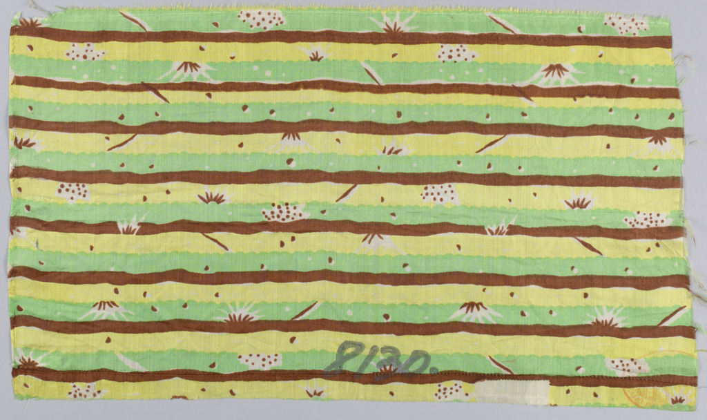 This is a Textile. It was possibly by Wiener Werkstätte. It is dated 1920–30 and we acquired it in 1958. Its technique is printed on plain weave (yellow and green, block-printed; brown, possibly painted). It is a part of the Textiles department.
