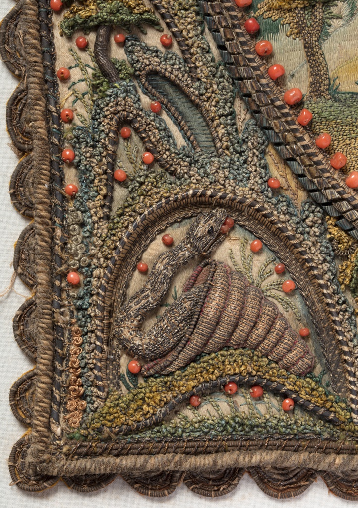 SB: Generally speaking, animals in textile designs of the 17th century are conventionalized and static, while these seem coiled with energy. Partly that’s showmanship on the part of the embroiderers—the highly dimensional forms and the textured stitching in the metallic embroidery combine to give a very life-like feeling to the salamander and the snakes. But the rendering of their forms also feels tensed.