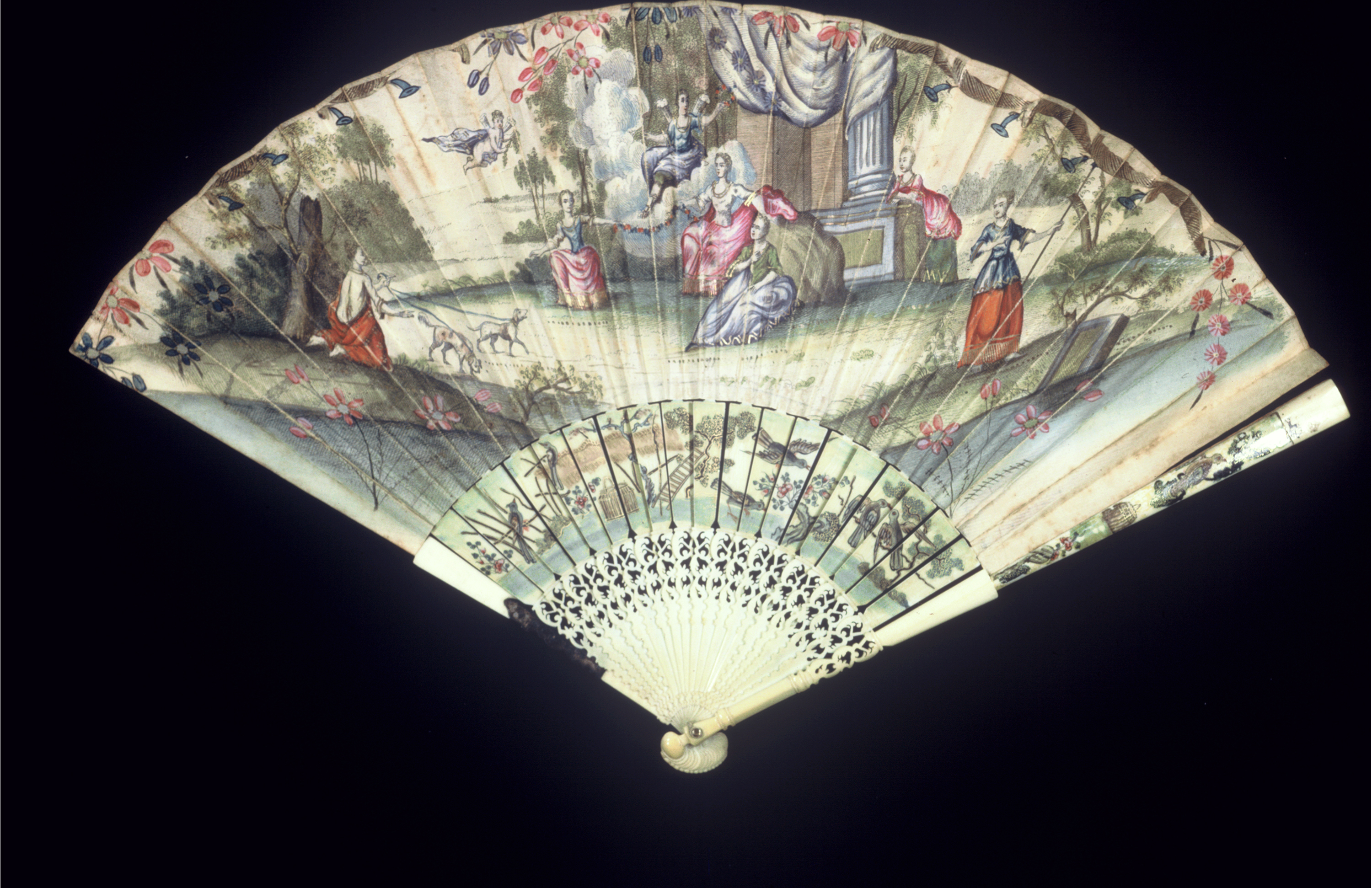 This is a Pleated fan. It is dated 1725–40 and we acquired it in 1959. Its medium is paper leaf with hand-colored etching, pierced and painted ivory sticks, rivet set with faceted stone. It is a part of the Textiles department.