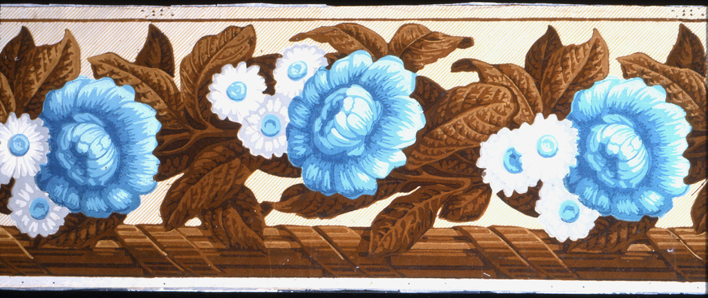 This is a Border. It is dated 1835 and we acquired it in 1959. Its medium is block-printed and flocked on handmade paper. It is a part of the Wallcoverings department.