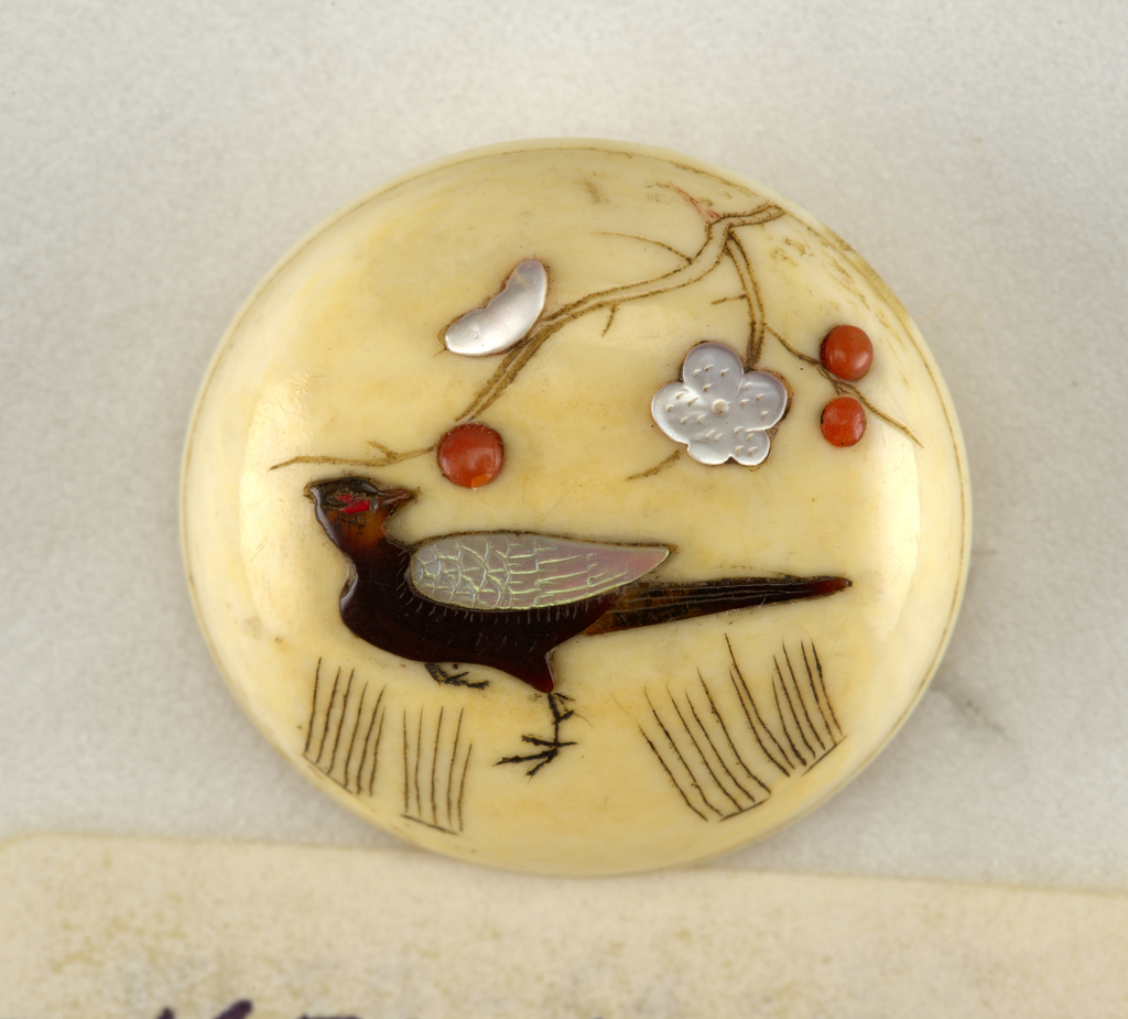 Button (Japan); ivory, mother-of-pearl, coral; Bequest of Julia Hutchins Wolcott; 1959-66-158