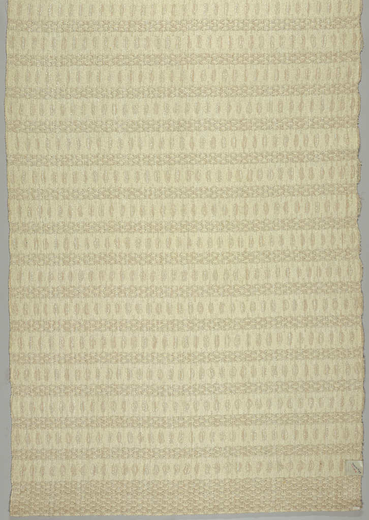 This is a Hanging. It was designed by Maria Kipp and woven by Maria Kipp. It is dated 1958 and we acquired it in 1959. Its medium is rayon, linen, metallic thread and its technique is plain weave. It is a part of the Textiles department.