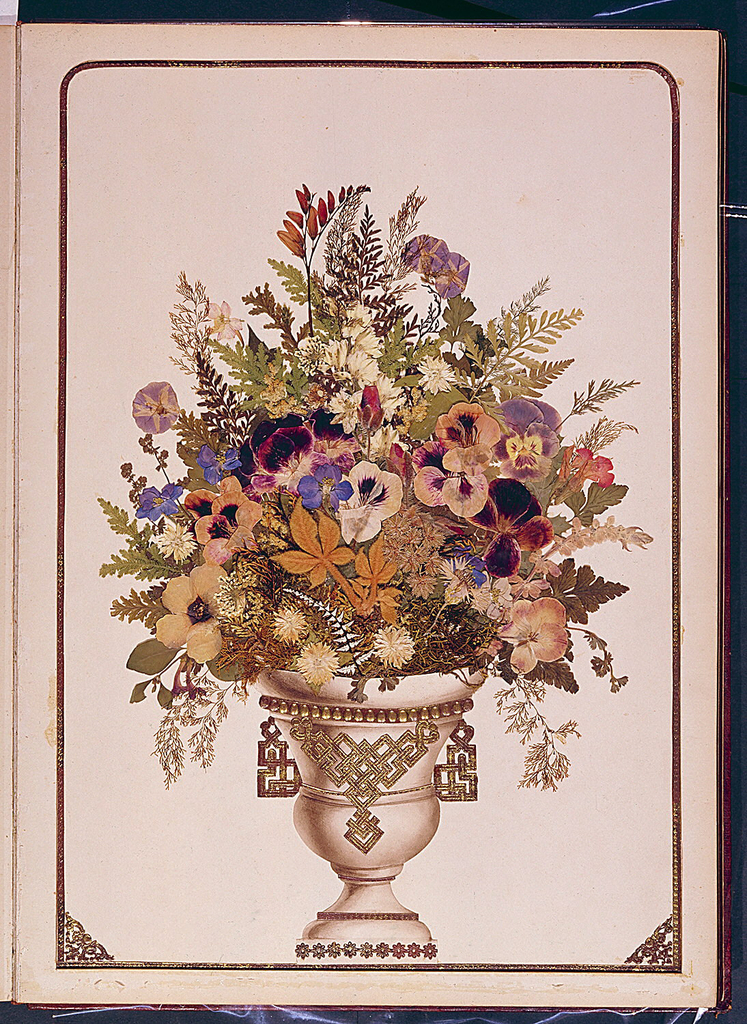 This is a Album. It is dated ca. 1872 and we acquired it in 1960. Its medium is pressed flowers in purple leather binding studded with mother-of-pearl. It is a part of the Drawings, Prints, and Graphic Design department.