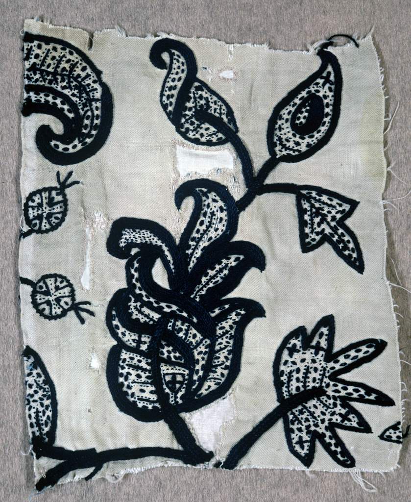 This is a Fragment. It is dated 17th–18th century and we acquired it in 1960. Its medium is wool on cotton and its technique is embroidered on twill weave. It is a part of the Textiles department.