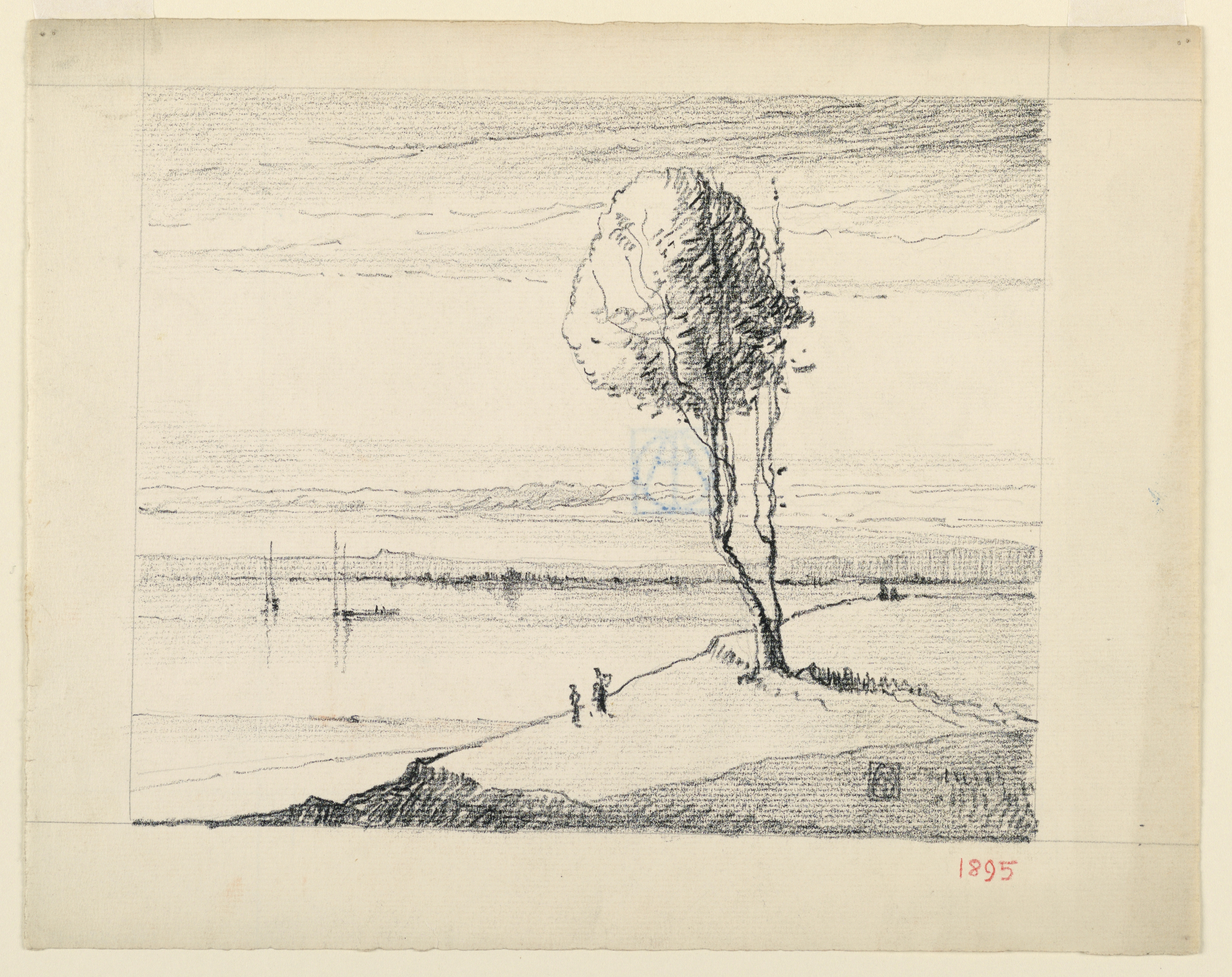 Drawing, Hillside and Tree with Sailboats in Distance; Leon Dabo (1868–1960); USA; black crayon on laid paper; 25.5 × 32.2 cm (10 1/16 × 12 11/16 in.); 1960-239-11