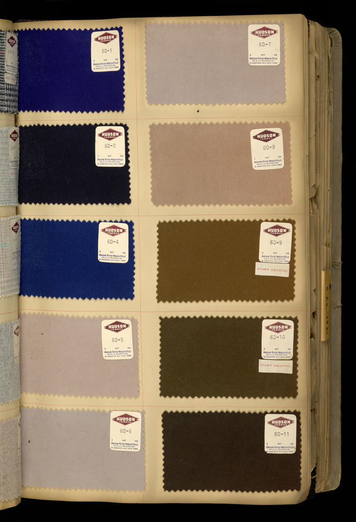 This is a Sample book. It was manufactured by Richard Fensterer and Company, Commodore Woolen Company, Hudson River Fabrics Company and H.G. Moore & Company. It is dated ca. 1920 and we acquired it in 1960. Its medium is clothbound covers, woven wool samples. It is a part of the Textiles department.