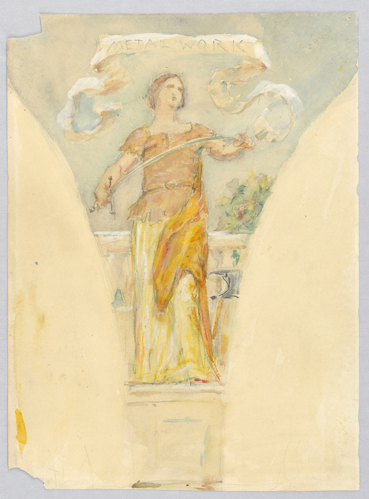 Drawing, Personification of "Metalwork," Study for the Dome of the Manufacturer's Building, World's Columbian Exposition, Chicago, IL; Kenyon Cox (American, 1856–1919); Made for World's Columbian Exposition; USA; brush and watercolor, white gouache, graphite on paper; 34.3 × 25.3 cm (13 1/2 × 9 15/16 in.); Gift of Allyn Cox; 1960-83-106