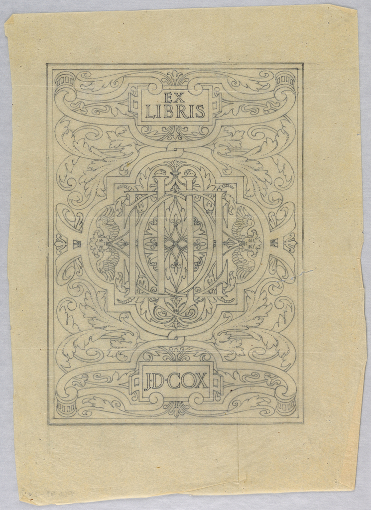 Drawing, Study of Bookplate Design for J. D. Cox; Kenyon Cox (American, 1856–1919); USA; graphite on tracing paper; 42.2 × 30.7 cm (16 5/8 × 12 1/16 in.); Gift of Allyn Cox; 1960-83-124