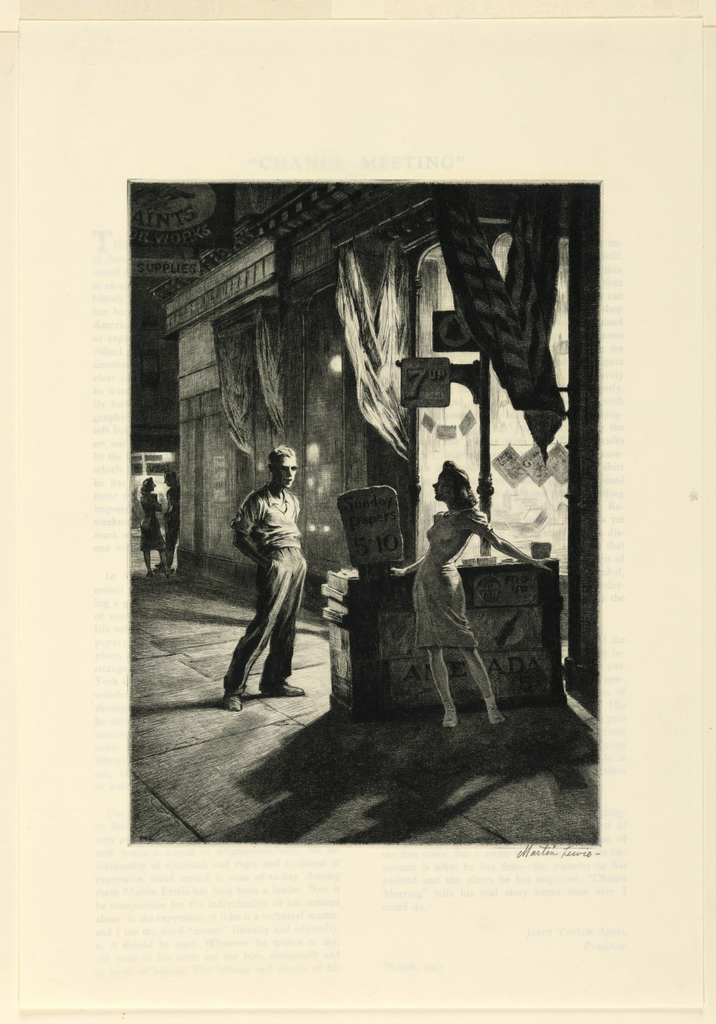 Print, Chance Meeting; Martin Lewis (American, b. Australia, 1882–1962); USA; drypoint in black ink on paper; Platemark: 26.7 × 19.1 cm (10 1/2 × 7 1/2 in.); Gift of Mr. and Mrs. Milton I.D. Einstein; 1961-1-109