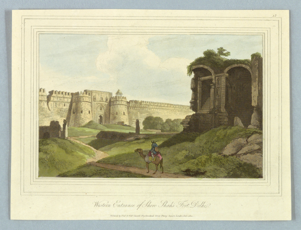 Print, Western Entrance of Shere Shah's Fort Delhi; Published by Thomas Daniell (British, 1749 - 1840); aquatint, brush and watercolor on paper; 17.8 × 23.5 cm (7 in. × 9 1/4 in.); Gift of Hamill and Barker; 1961-105-312