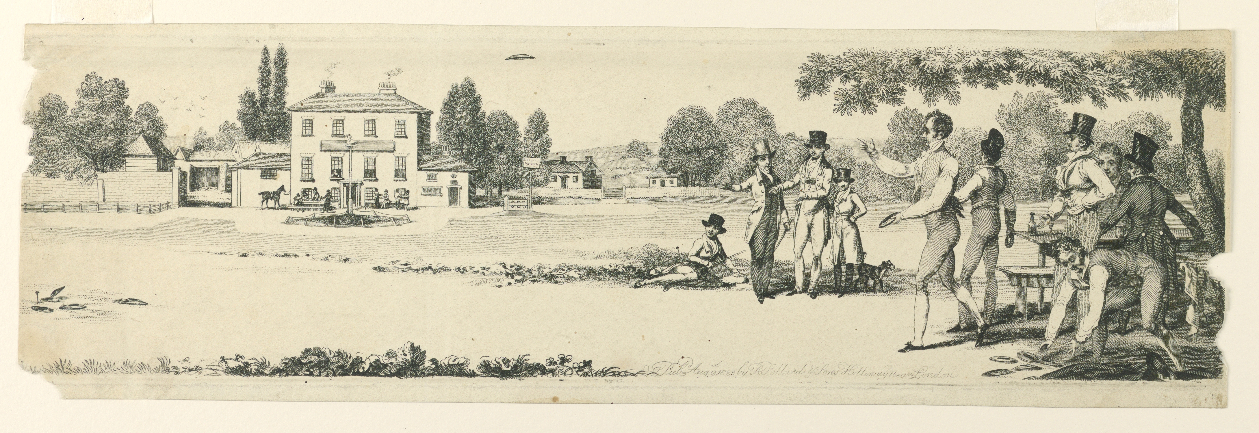 Print, Pitching Quoits (Part of a Panorama); Published by Robert Pollard (English, 1755 - 1838); England; etching on paper; 10.8 × 34.5 cm (4 1/4 × 13 9/16 in.); Gift of Hamill and Barker; 1961-105-98