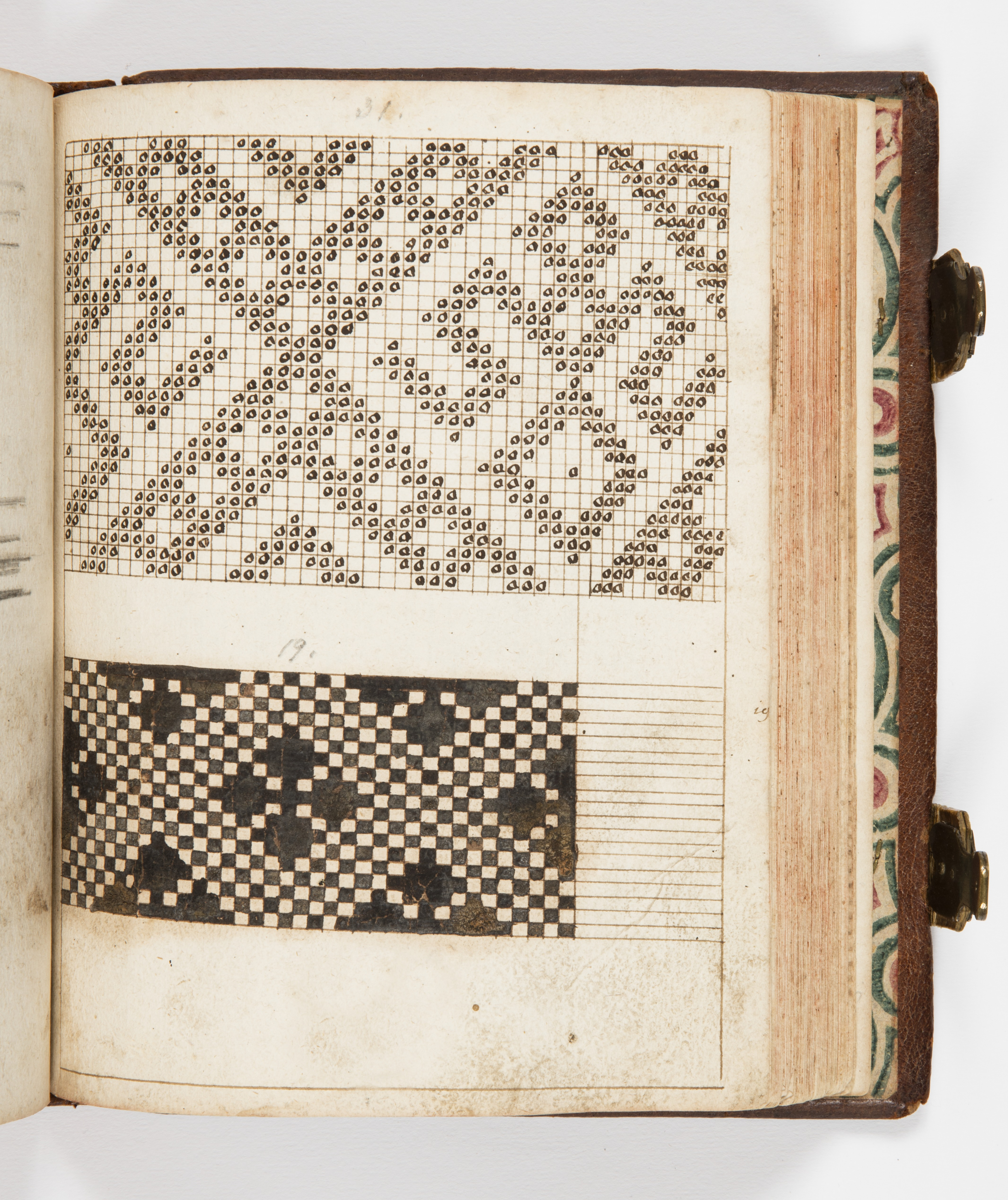 This is a Pattern book. It is dated 1760 and we acquired it in 1961. Its medium is leather, paper, metal. It is a part of the Textiles department.