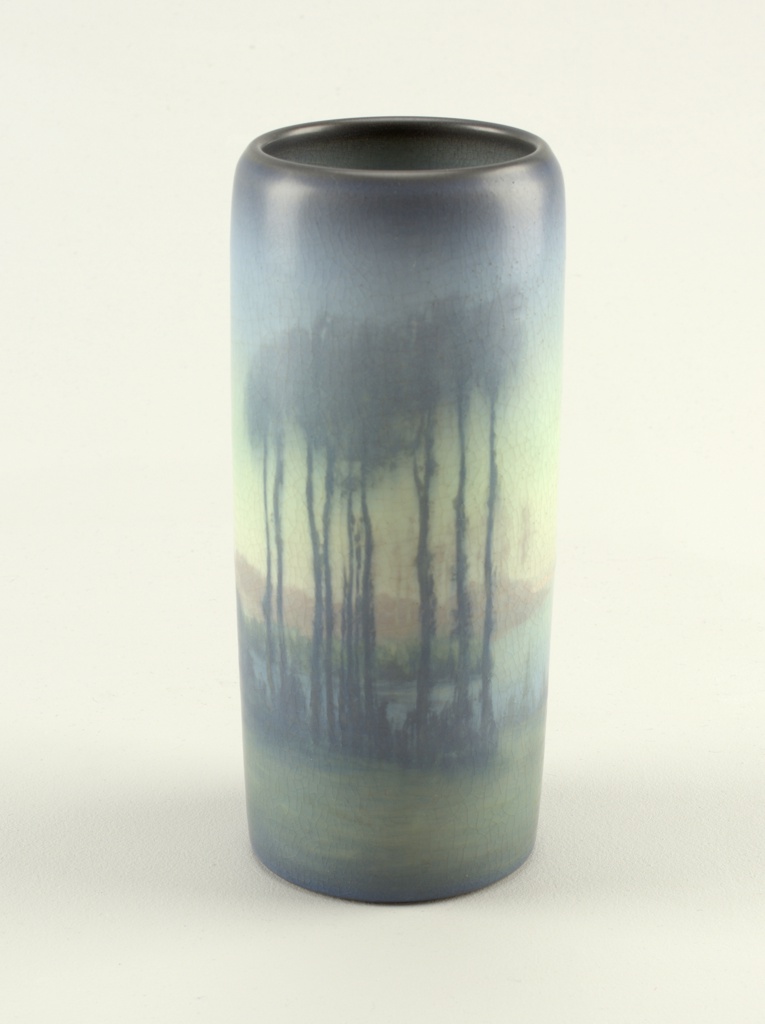 This is a Vase. It was created by Sarah Elizabeth Coyne and manufactured by Rookwood Pottery. It is dated ca. 1913 and we acquired it in 1961. Its medium is earthenware with underglaze. It is a part of the Product Design and Decorative Arts department.