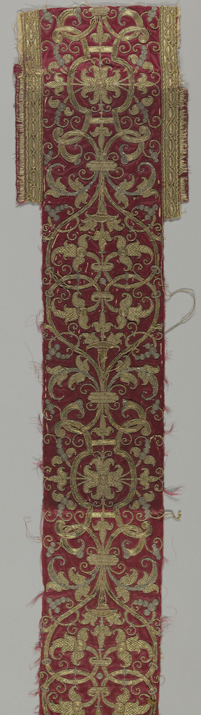 This is a Textile. We acquired it in 1961. Its technique is embroidered on silk foundation. It is a part of the Textiles department.