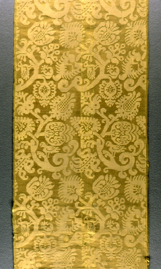 This is a Fragments. It is dated 17th century and we acquired it in 1961. Its medium is silk and its technique is 5-harness satin damask. It is a part of the Textiles department.