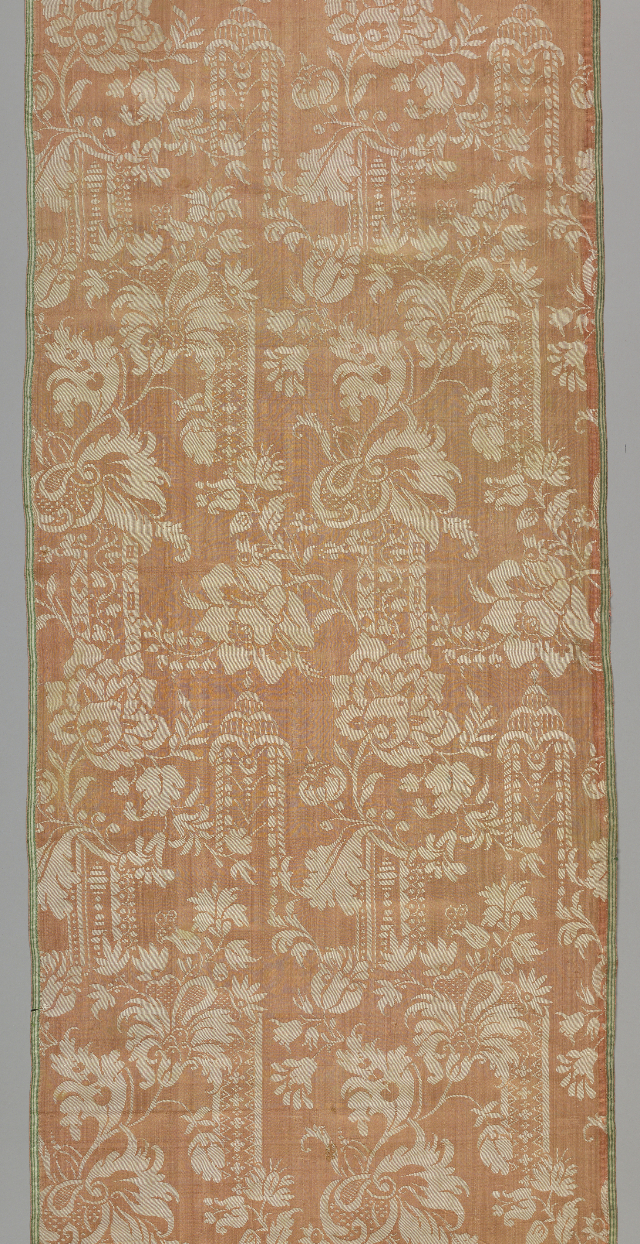 This is a Fragment. It is dated mid-18th century and we acquired it in 1961. Its medium is silk and its technique is damassé (5-harness satin plus 1\4 twill). It is a part of the Textiles department.