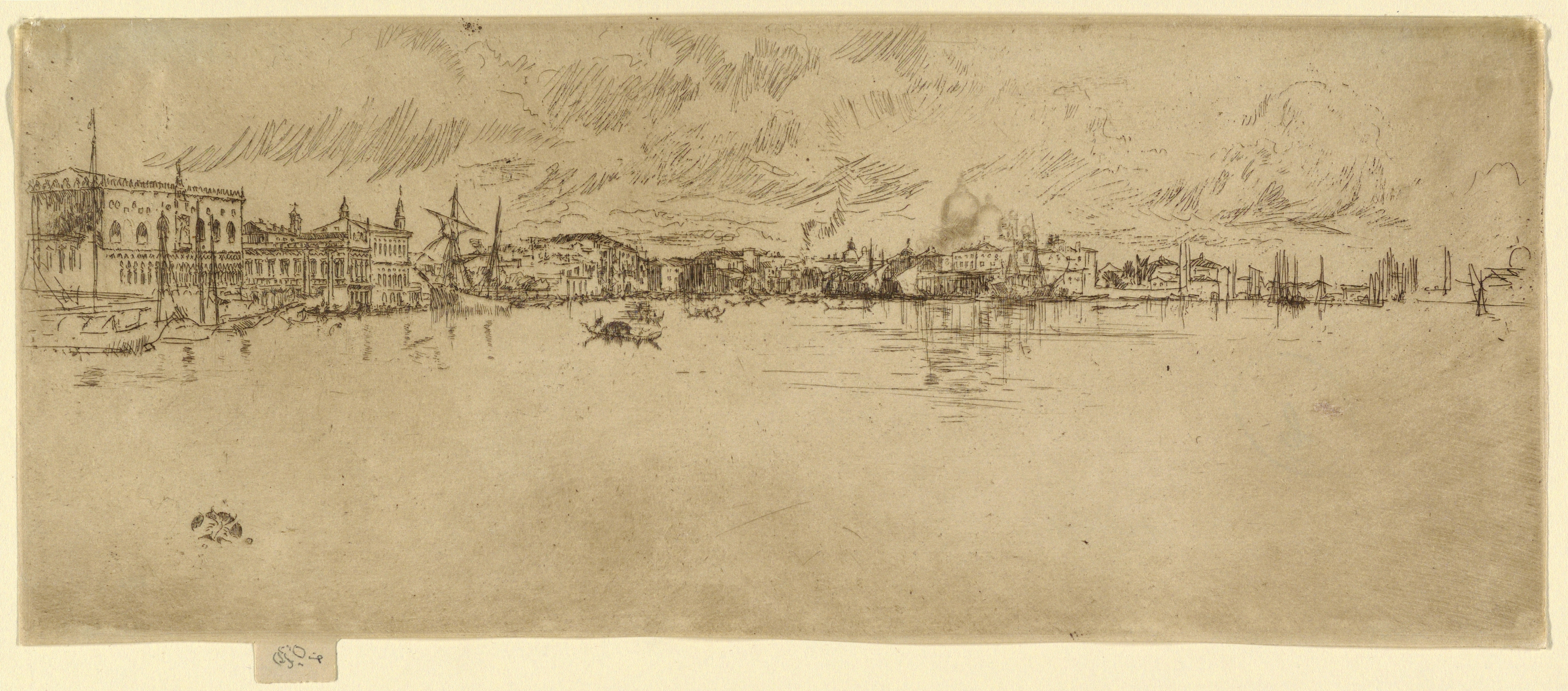 Positioning himself on the Riva degli Schiavoni, west of the Chiesa della Pietà – Santa Maria della Visitazione, the panoramic view of the historic harbor became the subject of a series of etchings, including Long Venice. Whistler’s vision of the Venetian shoreline differed from the romantic and mysterious city, portrayed by Francesco Lazzaro Guardi (1712-1793) and Joseph Mallord William Turner (1775-1851), popular throughout the nineteenth century. By drawing with a needle directly onto a prepared copper plate, Whistler developed a type of shorthand notation to instill the beauty of the scene. The view was reversed in the printing process, yet the architecture and setting remained recognizable on the final print. The delicate lines and size of print encouraged close examination to audiences in London—with time the soft brown tones of the ink morphed into a lingering fog and the brief markings delineated gondolieri scattered throughout the Grand Canal for the viewer.