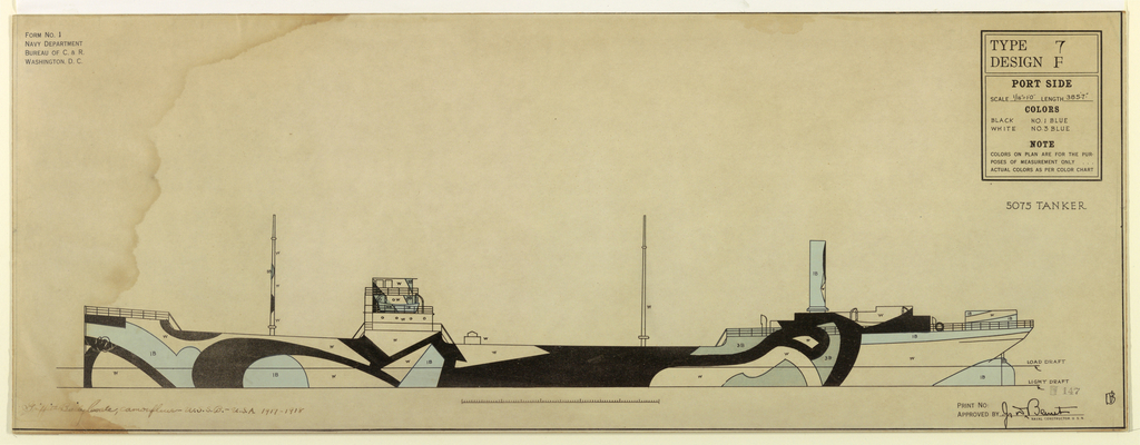 Print, Port Side of 5075 Tanker, Showing Camouflage; Designed by Griffiths Baily Coale (American, 1890–1950); USA; color lithograph on paper, laid down on cardboard; 26.9 × 72 cm (10 9/16 × 28 3/8 in.); Gift of Mrs. Griffith Baily Coale; 1962-135-3