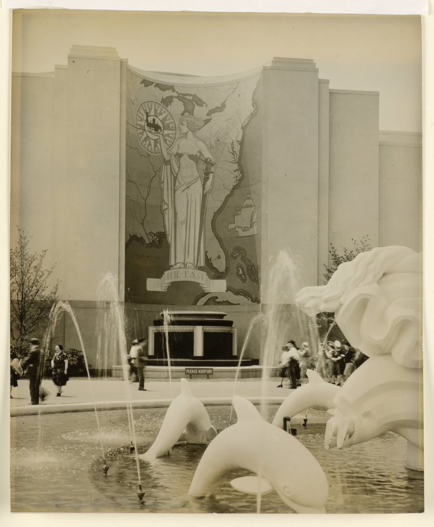 Drawing, View of the Facade of the Railroads Building, New York World's Fair, Showing "The East" Mural; Designed by Griffiths Baily Coale (American, 1890–1950); USA; photograph printed on sensitized paper; 23.4 × 19.2 cm (9 3/16 × 7 9/16 in.); Gift of Mrs. Griffith Baily Coale; 1962-135-37