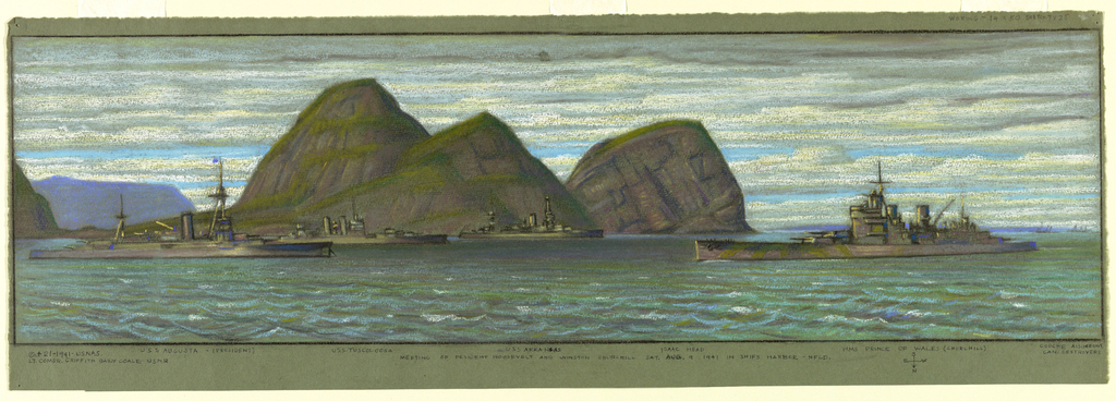 Inscribed in pen and black ink, lower left: Oct 21-1941-U.S.N.A.S.; lower center: MEETING OF PRESIDENT ROOSEVELT AND WINSTON CHURCHILL SAT. AUG. 9 1941 IN SHIPS HARBOR - NFLD.