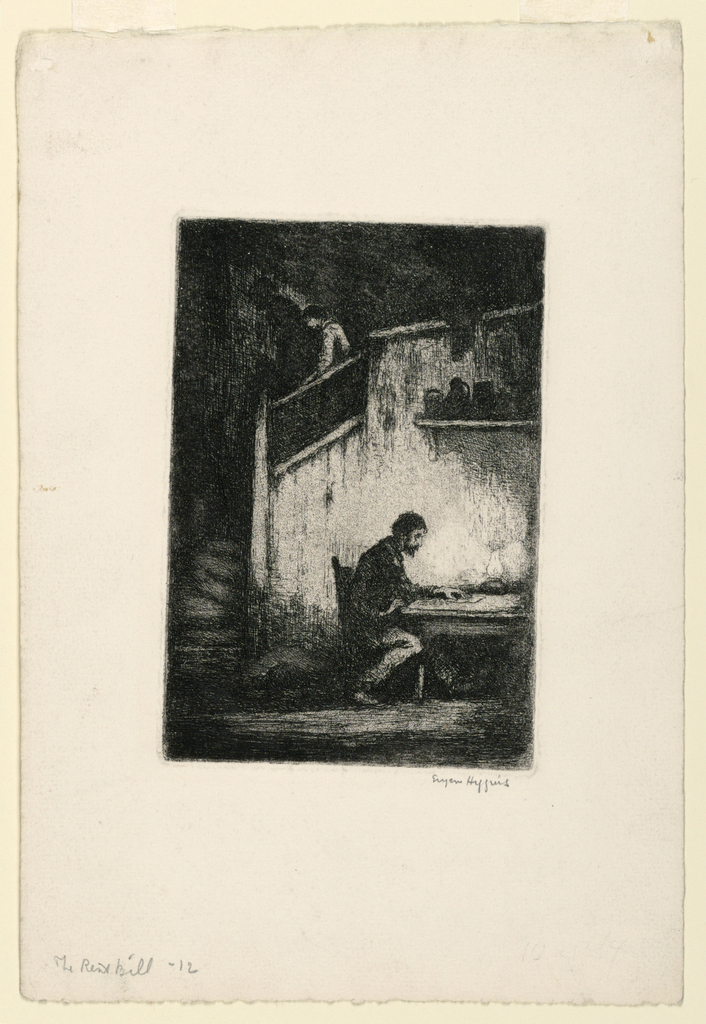 This is a Print. It was created by Eugene Higgins. It is dated 1913 and we acquired it in 1962. Its medium is etching in dark brown ink on paper. It is a part of the Drawings, Prints, and Graphic Design department.