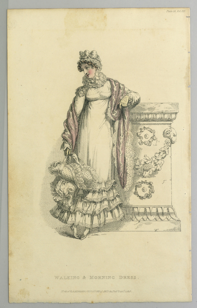 Print, Walking and Morning Dress; Published by Ackermann’s, Rudolph Ackermann (English, b. Germany, 1764–1834); engraving, brush and watercolor on paper; 23.6 × 14.7 cm (9 5/16 × 5 13/16 in.); Gift of Hamill and Barker; 1962-143-11