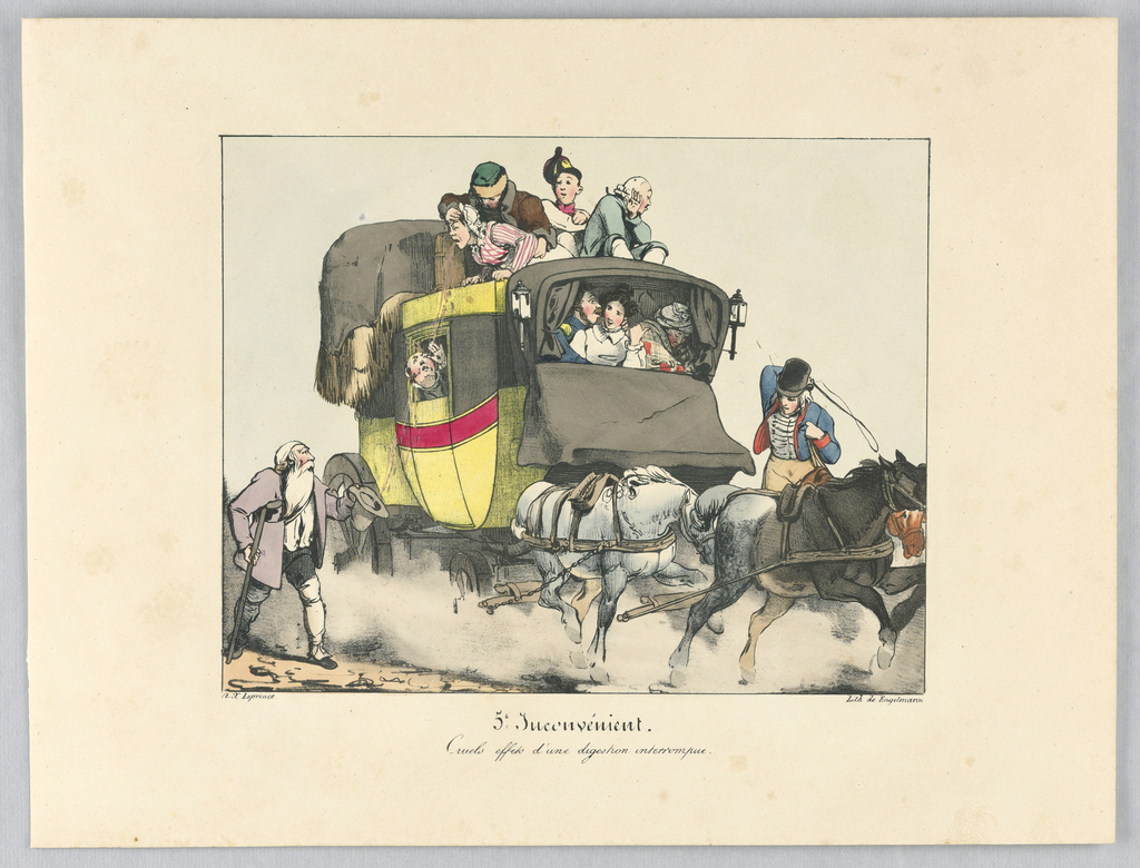 Print, Cruel effets d'une digestion interrompue, Plate 5 from "Inconvénient"; Auguste-Xavier Leprince (French, 1799 - 1826); Print Maker: Gottfried Engelmann (1788 – 1839); lithograph, brush and watercolor on paper; 25.3 × 33.2 cm (9 15/16 × 13 1/16 in.); Gift of Hamill and Barker; 1962-143-112
