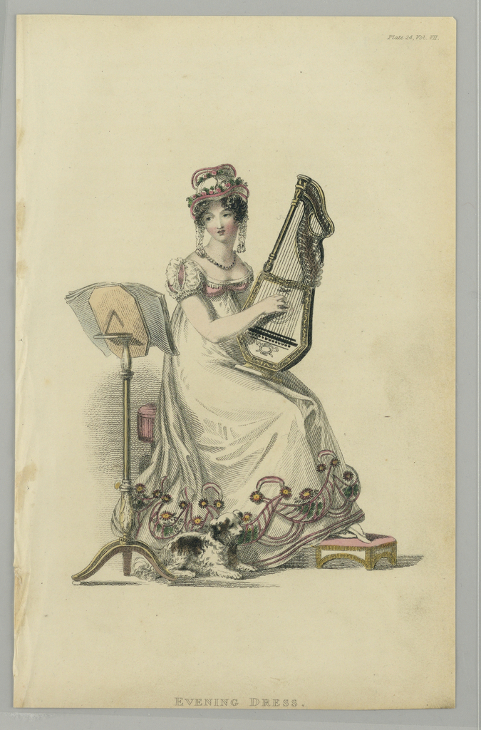 Print, Evening Dress; Published by Rudolph Ackermann (English, b. Germany, 1764–1834); engraving, brush and watercolor on paper; 22.5 × 14.2 cm (8 7/8 × 5 9/16 in.); Gift of Hamill and Barker; 1962-143-6