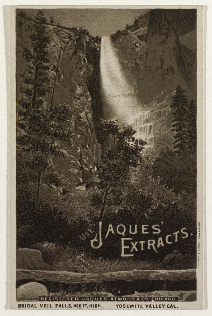 Trade Card, Jaques' Extracts showing Bridal Veil Falls, Yosemite Valley, California; Manufactured by Jaques Atwood & Co., Chicago, Illinois; lithograph on heavy white wove paper; Overall: 12.1 x 7.6 cm (4 3/4 x 3 in.); Gift of Carol MacDonald; 1962-149-11-f