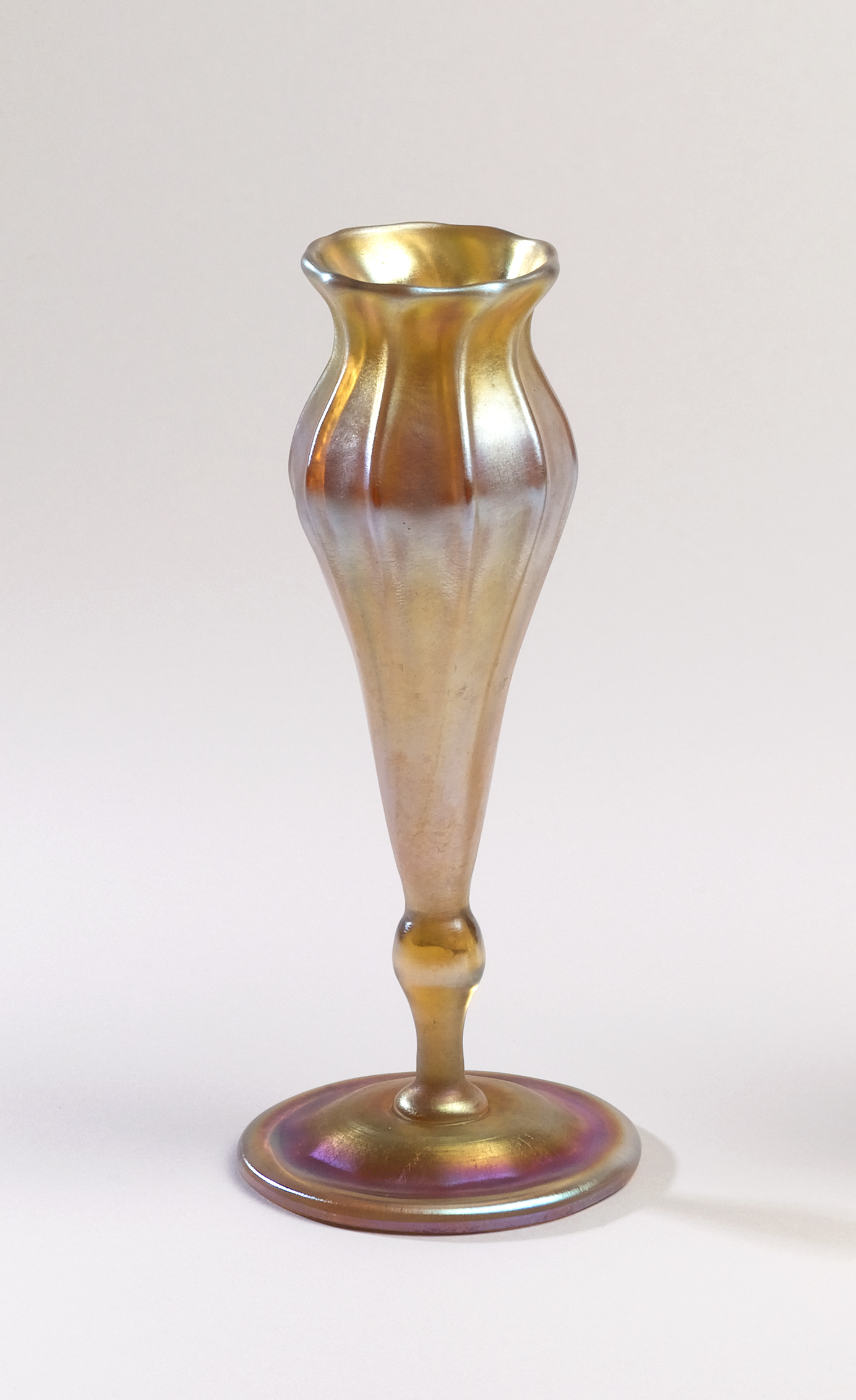 This is a Vase with box. It was made by Louis Comfort Tiffany. It is dated ca. 1910 and we acquired it in 1962. Its medium is favrile glass; cardboard, paper (box). It is a part of the Product Design and Decorative Arts department.