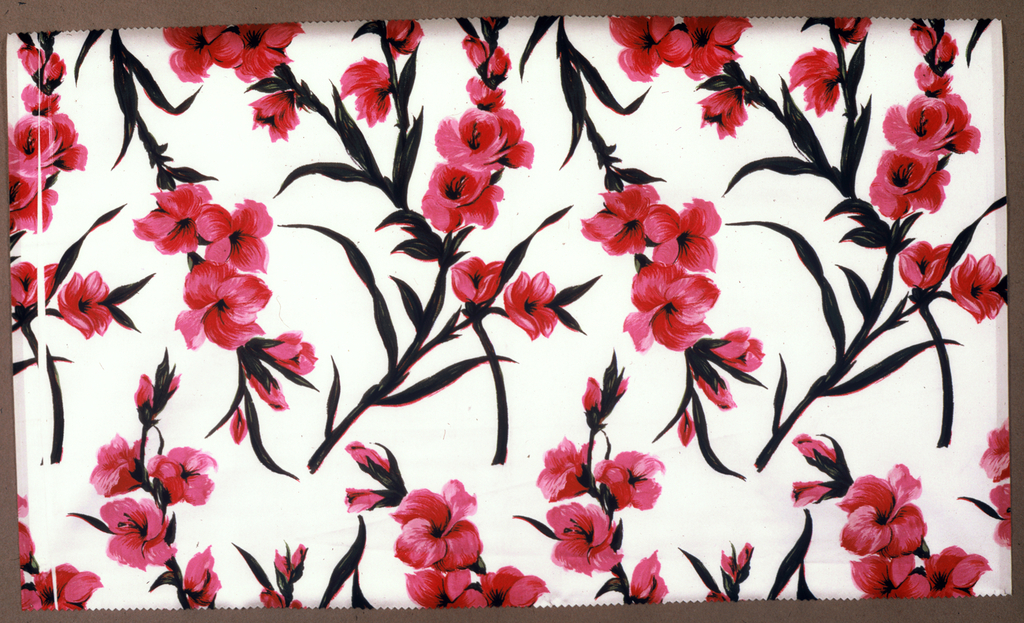 This is a Textile. It was manufactured by Les Petit Fils de C.J. Bonnet. It is dated 1962 and we acquired it in 1962. Its medium is silk and its technique is screen printed on hand cut satin. It is a part of the Textiles department.