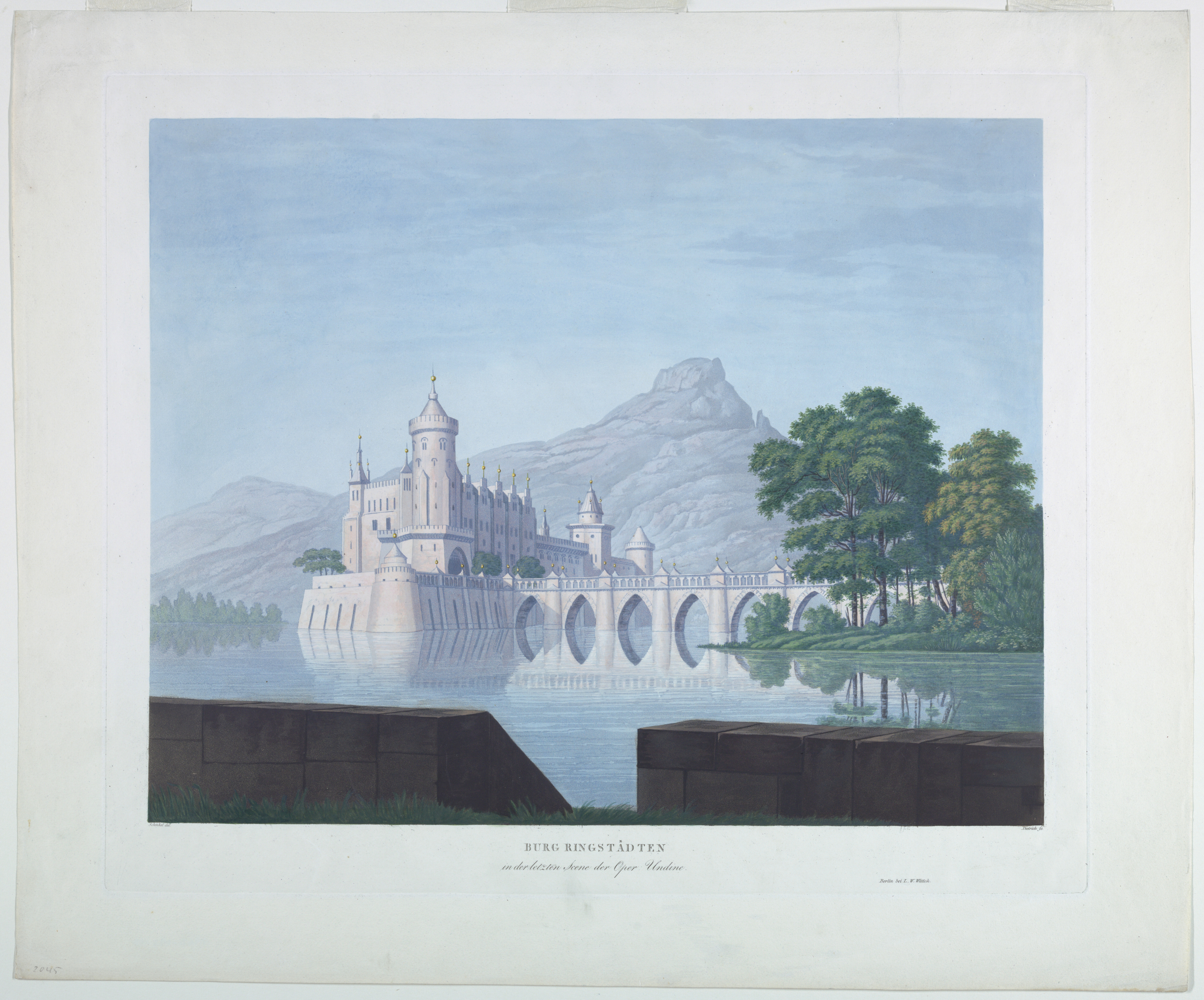 Print, Stage Design: Ringstadten Castle, for the Last Scene of Undine; Designed by Karl Friedrich Schinkel (German, 1781–1841); Written by E.T.A. Horrmann (Prussian, 1776–1822); Engraved by Friedrich Christophe Dietrich (1779–1847); Germany; colored acquatint; Platemark: 42.1 × 50.4 cm (16 9/16 × 19 13/16 in.) Mat: 55.9 × 71.1 cm (22 × 28 in.); Museum purchase through gift of Mrs. William G. Fitch; 1962-192-12