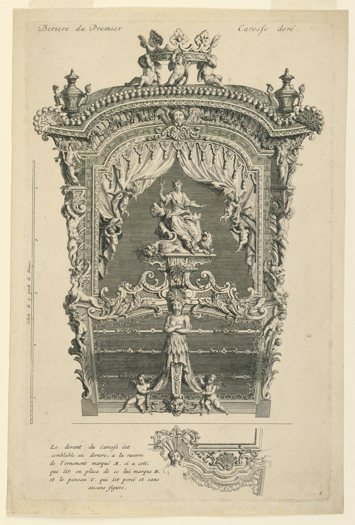 Print, Rear View of the First Gilded Carriage; Designed by Bernard Picart (1673–1733); France; engraving in black ink on paper; H x W: 36.4 × 23.1 cm (14 5/16 × 9 1/8 in.); Museum purchase through gift of Mrs. William G. Fitch; 1962-192-13